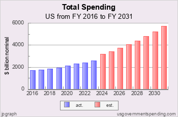 Account level spending estimates through FY 2031 come from the Outlays table in the Public Budget Database and were updated on usgovernmentspending.com on April 4, 2026.